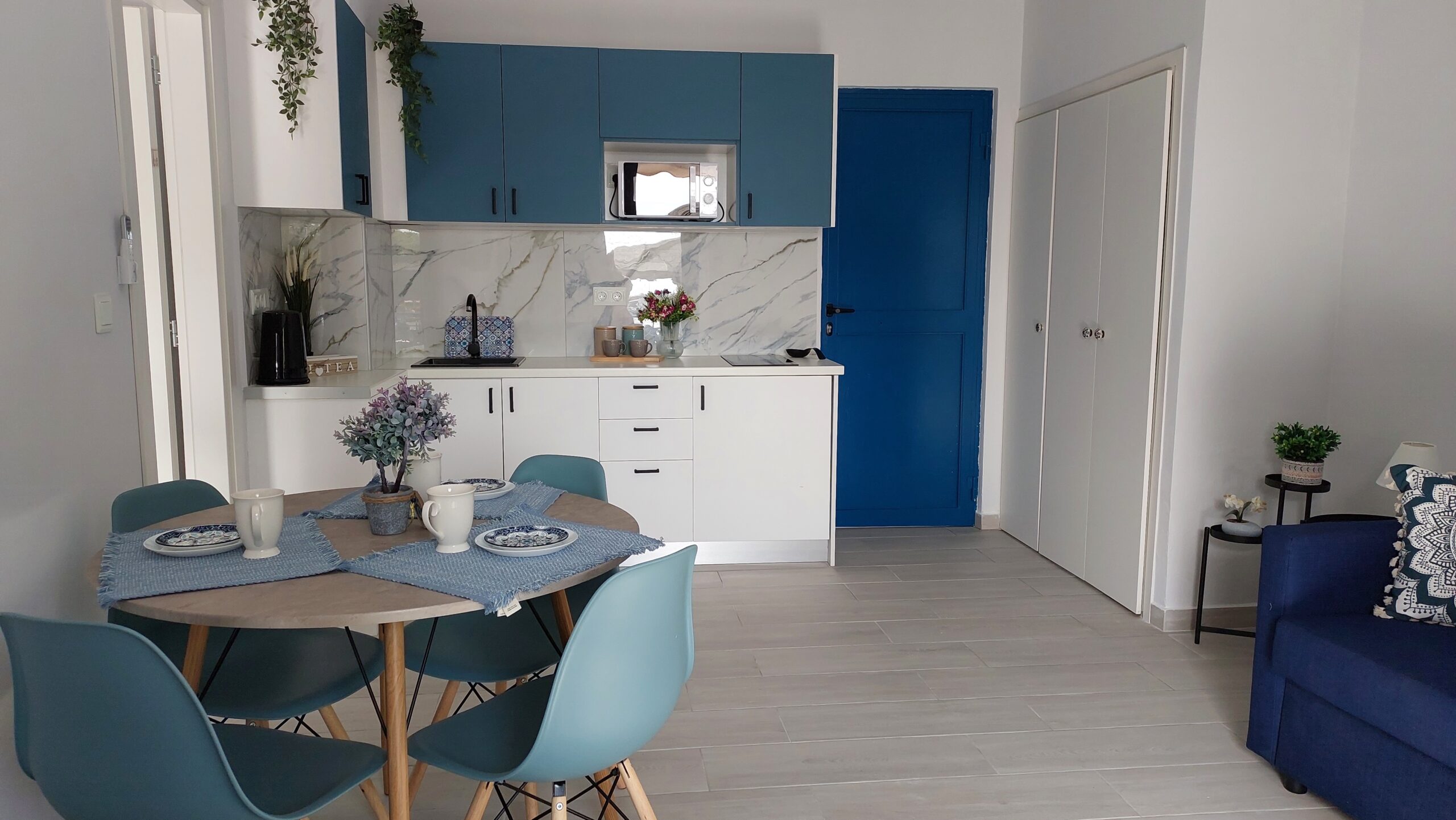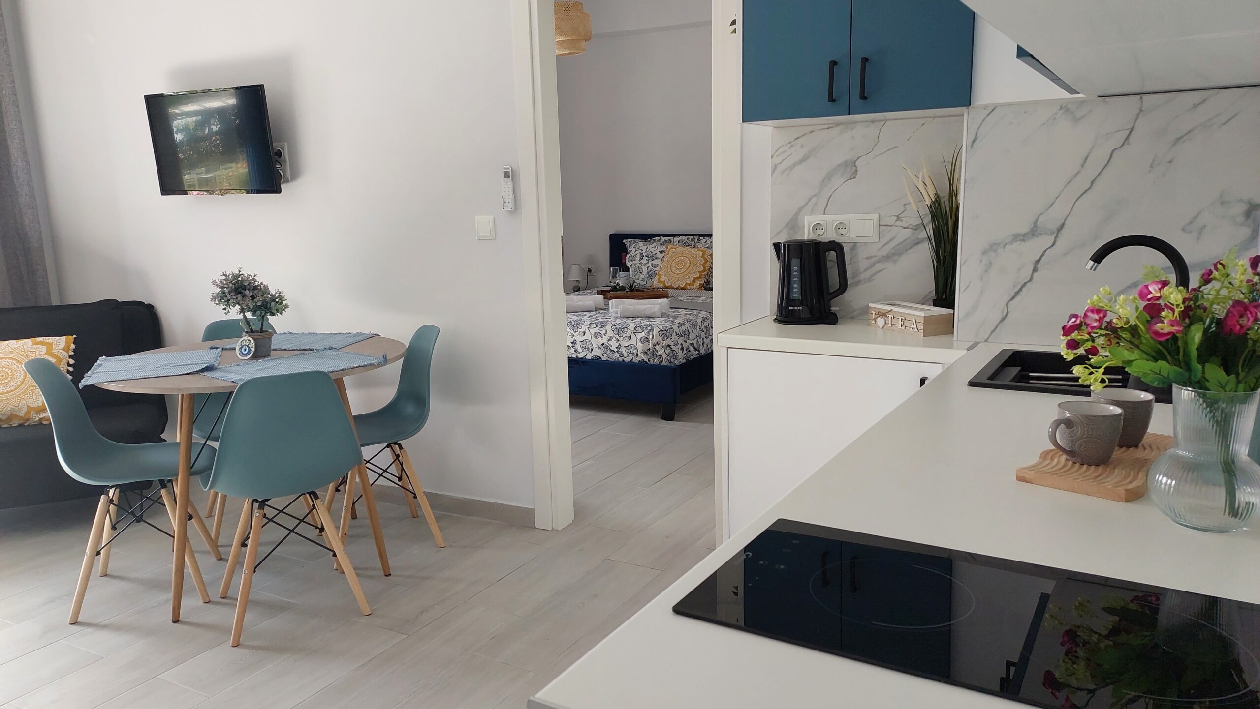 Apartamenty są świeżo po remoncie, wyposażone zostały we wszystkie sprzęty i akcesoria przydatne do codziennego użytku. W skład wyposażenia każdego apartamentu wchodzą m.in. klimatyzacja, WiFi, żelazko, suszarka do włosów, suszarka do prania, toster, czajnik, płyta indukcyjna, lodówka, wyposażenie kuchni, ręczniki oraz pościel. Studio znajduje się na pierwszym piętrze. Składa się z pokoju wraz z aneksem kuchennym, łazienki oraz balkonu z pięknym widokiem na morze. Apartament zlokalizowany jest na parterze, składa się salonu z aneksem kuchennym i balkonem z widokiem na morze oraz wyjściem na patio wewnątrz budynku, a także sypialni z łazienką i balkonem.